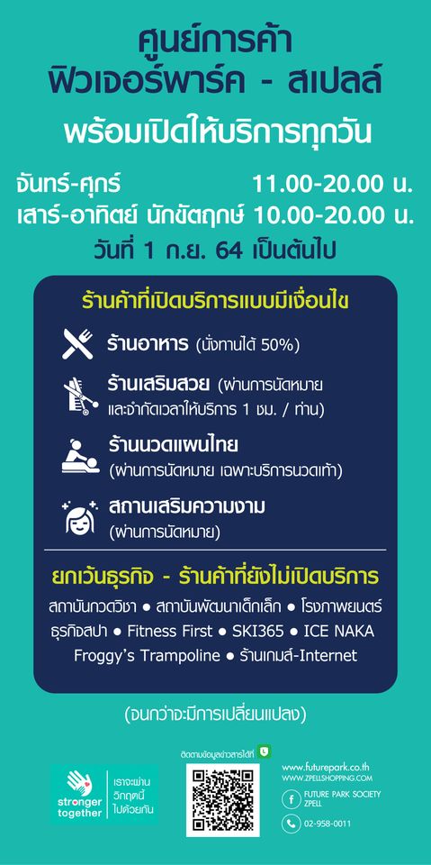 ฟิวเจอร์พาร์ค และสเปลล์ เปิดให้บริการทุกวัน ตั้งแต่วันที่ 1 กันยายน 2564 เป็นต้นไป